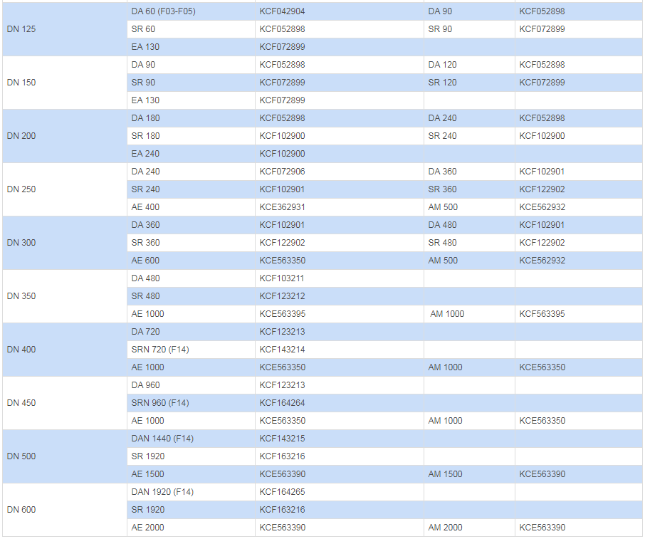 | DN 125 | KGFE0073 | KGFN0073 | KGFV0073 | KGFA0073 | KGFC0073 | KGFG0073 |